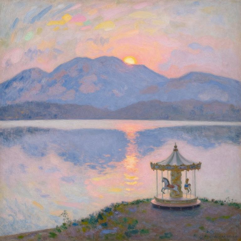 Craft an image reminiscent of Hermes Monet's impressionist techniques, portraying a tranquil lake at dusk from a unique 'bug's-eye view'. Distant mountains gracefully mirror on the serene waters as soft pastel hues and loose brushstrokes blend together, invoking a sense of serenity and contemplative wonder. Include a whimsical yet poignant vintage carousel horse standing atop a hill overlooking the scene, bathed in the warm glow of the setting sun—a gentle reminder of life's fleeting moments.