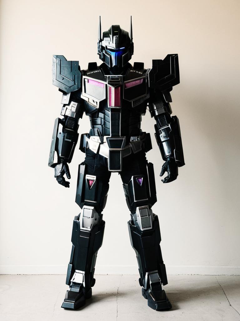 Man cosplay. Wearing Nemesis Prime (G1) costume. Realistic photo. Dressed as Nemesis Prime (G1) --sref 1400