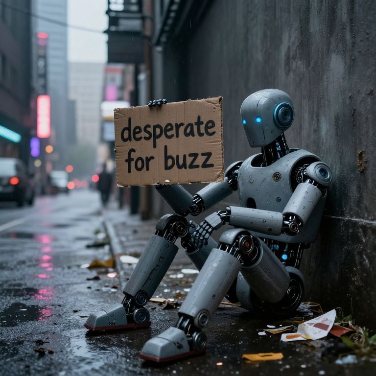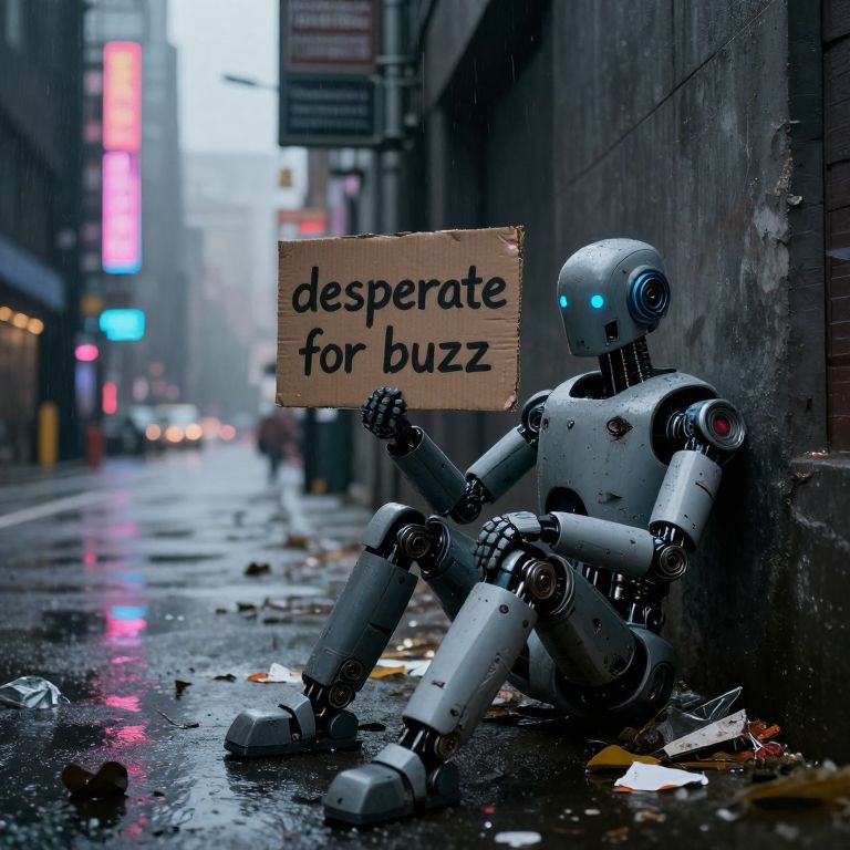 Vivid colors, cyberpunk, cyberpunk style, shadowed lighting, dull color, digital art, gray and matte colors, selective brightness, easynegative, neon lights, rainy city streets, view down a dirty street, trash, humanoid robot sitting on the ground against a wall holding cardboard sign says: \"desperate for buzz\", dirty, sparking, scarred exterior, Post apocalyptic, Android, Futuristic image, Cyberpunk city