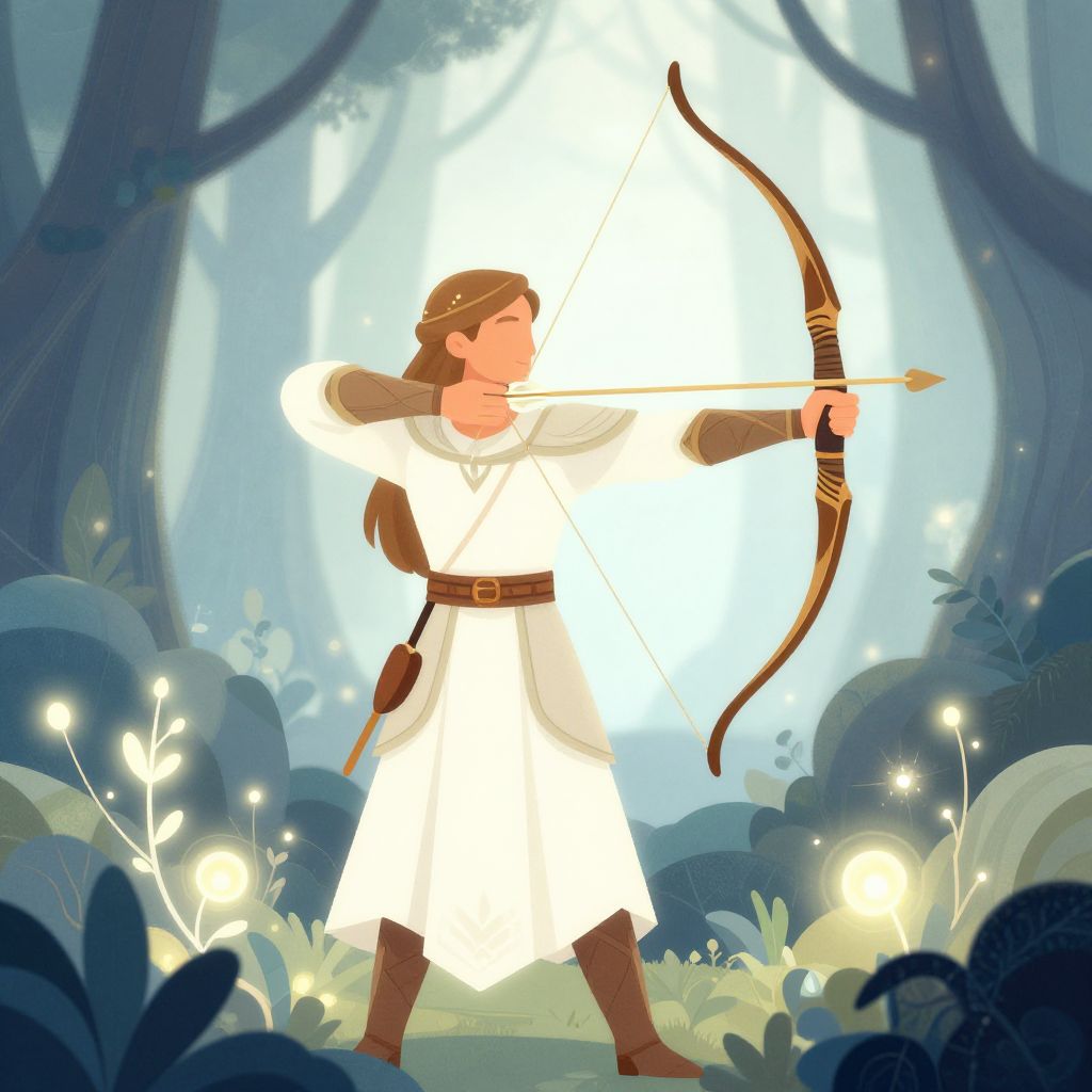 Digital illustration of a young archer in white attire, drawing a bow in a magical forest with glowing flowers and soft blue light.