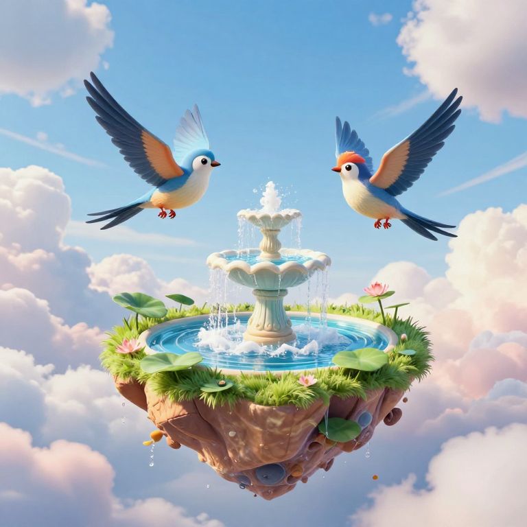 Digital illustration of two colorful birds with blue, orange, and white feathers flying around a floating, tiered fountain on a grassy, rocky island in a bright blue sky with fluffy white clouds. The birds, with small orange beaks and red feet, are mid-flight, facing each other. The fountain is white with water cascading down, surrounded by green lily pads and red flowers. The island has a brown, rocky base with green moss. The overall style is vibrant and whimsical, with a soft, almost magical atmosphere.