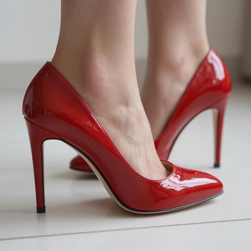 Photograph of a person's legs in bright pink high-heeled shoes with black soles, positioned against a plain white background. The legs are slightly crossed at the ankles, and the lighting is even, highlighting the shoes' vibrant color. The camera angle is slightly above and to the side, capturing a close-up view. The background is completely out of focus, drawing attention to the legs and shoes. The depth of field is shallow, with a blurred white backdrop.