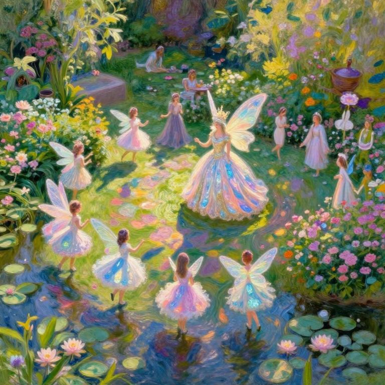 An aerial perspective reveals an enchanting garden gathering brimming with fantastical elements intertwined with impressionistic strokes. This vibrant scene, reminiscent of Monet's 'Water Lilies', unfolds within verdant landscapes, where iridescent fairies pirouette among blossoms, their wings casting mesmerizing patterns on the ground below. At the heart of this whimsical celebration stands a regal creature, its iridescent coat glistening under a warm and ethereal sunlight that bathes the scene in tranquility amidst the lively festivities. The harmonious fusion of fantasy and artistic style beckons viewers into a dreamlike world where magic and beauty intertwine in an unforgettable, enchanting moment.