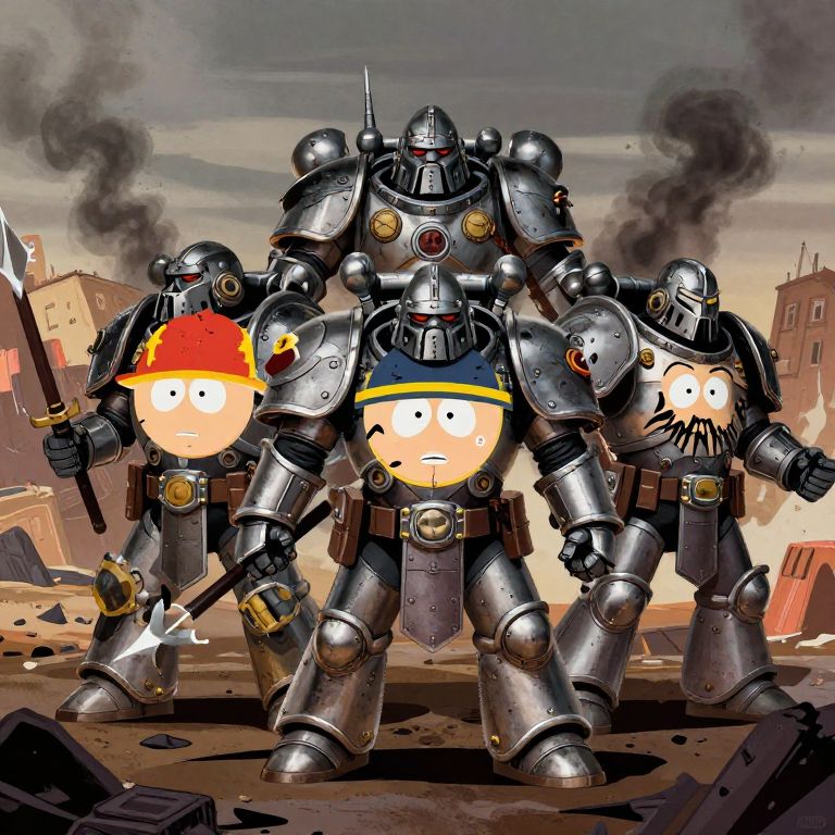 Southpark inspired Warhammer warriors standing united on a war-torn landscape, exaggerated cartoon faces with grim futuristic armor, steam and smoke in the distance, bold colors contrasting with metallic textures, energetic composition.