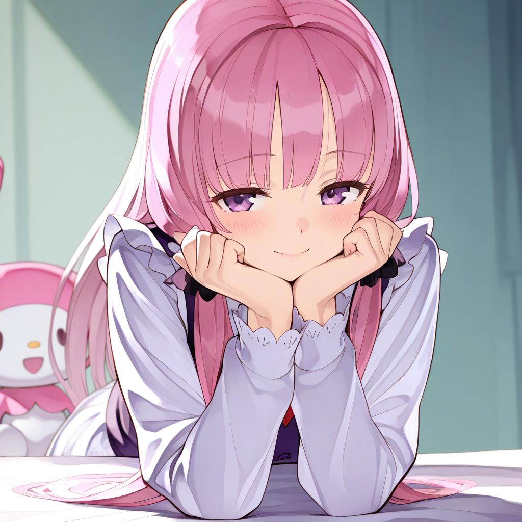 This digital anime-style drawing features a pink-haired girl with large, expressive purple eyes and a gentle smile. She rests her hands under her chin, elbows on a table. She wears a white long-sleeve blouse with ruffled cuffs. In the background, a blurred, pink-haired character with a white hat and red eyes sits. The background is a softly lit, teal-colored room with sunlight streaming in. The girl's hair is shiny and straight, and her cheeks have a subtle blush. The overall mood is calm and cute, with a focus on the girl's relaxed and happy expression.