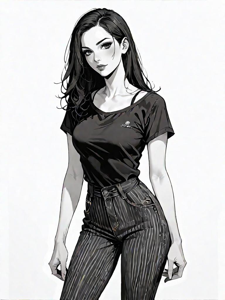 1girl, source_comics, realistic face, full body shot, Woman, professional attire, fitted blazer in gray with fine herringbone pattern, notched lapels, white silk button-up blouse, tucked into tailored high-waisted trousers in matching gray, teardrop pearl earrings, white studio background.