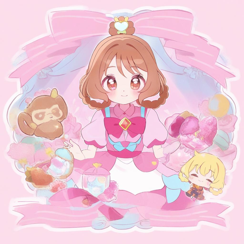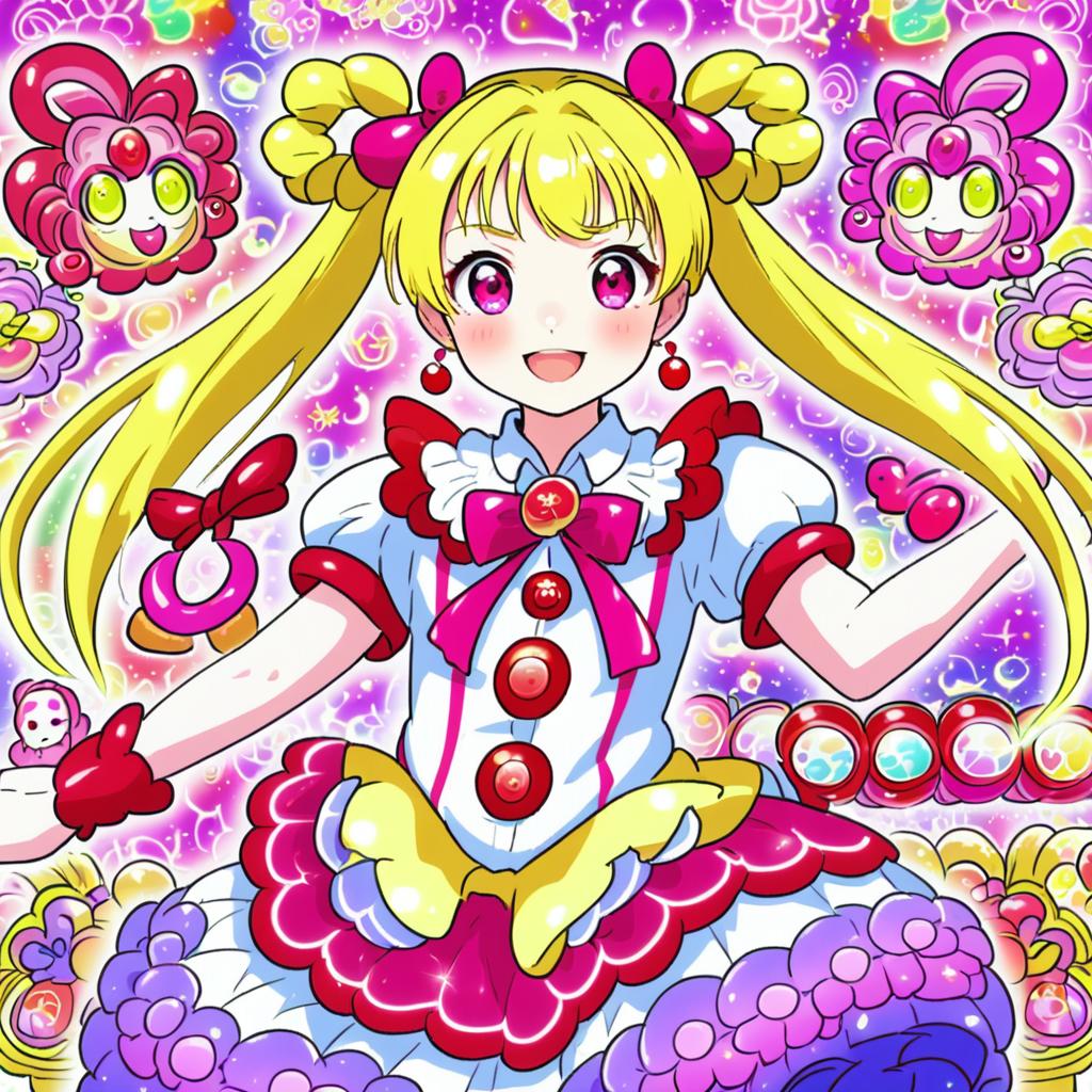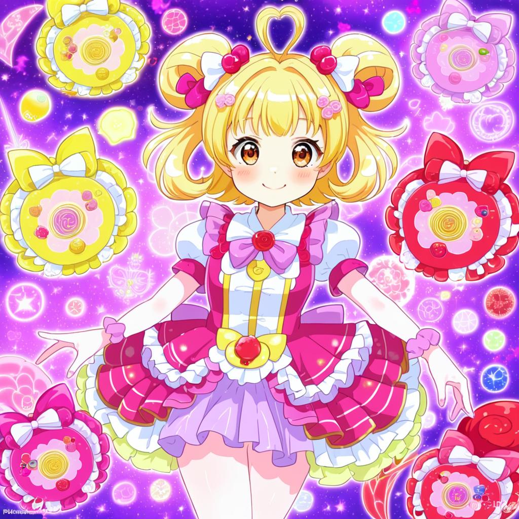 Hanamichi ran, delicious party precure, 1girl, red eyes, brown hair, blonde hair, short hair, medium hair, hair rings, magical girl, by artist usume shirou, leet