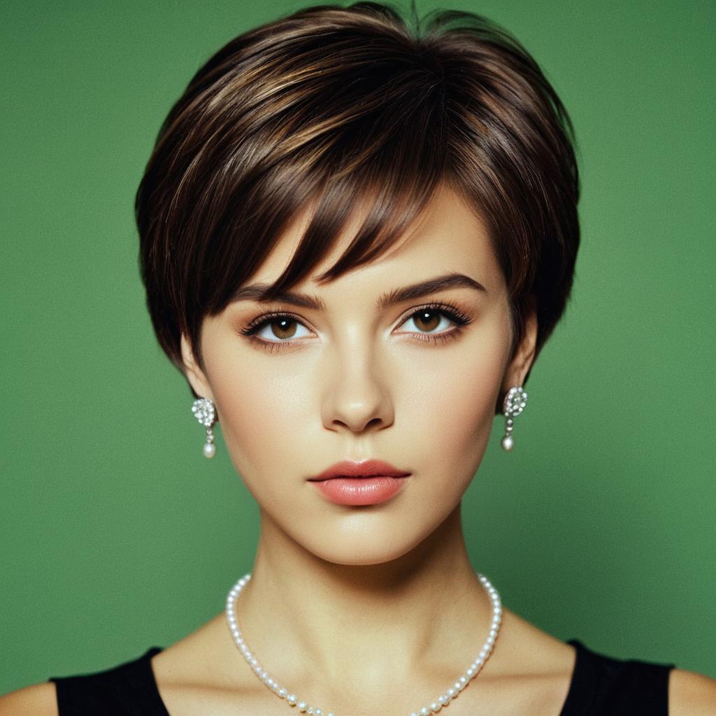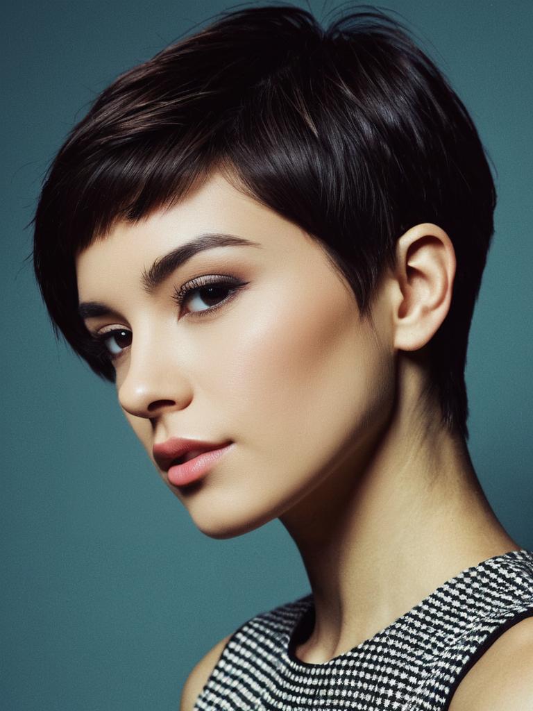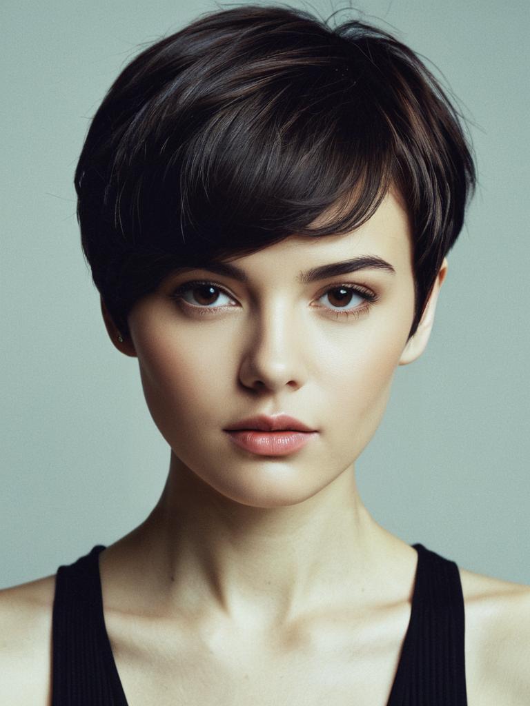 Woman with Dark Brown Pixie Cut, fashion editorial photo, photorealistic realism