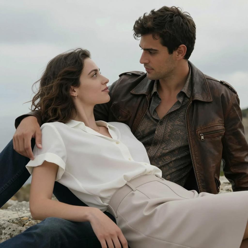 Man with short dark hair, wearing a dark knit sweater, hugs a woman with long brown hair and a light blue top. She rests her head on his shoulder, eyes closed. Dark, industrial background with dim lights and visible cables. Both stand in a tight embrace, man's right arm around woman's back. Two bright lights in background.