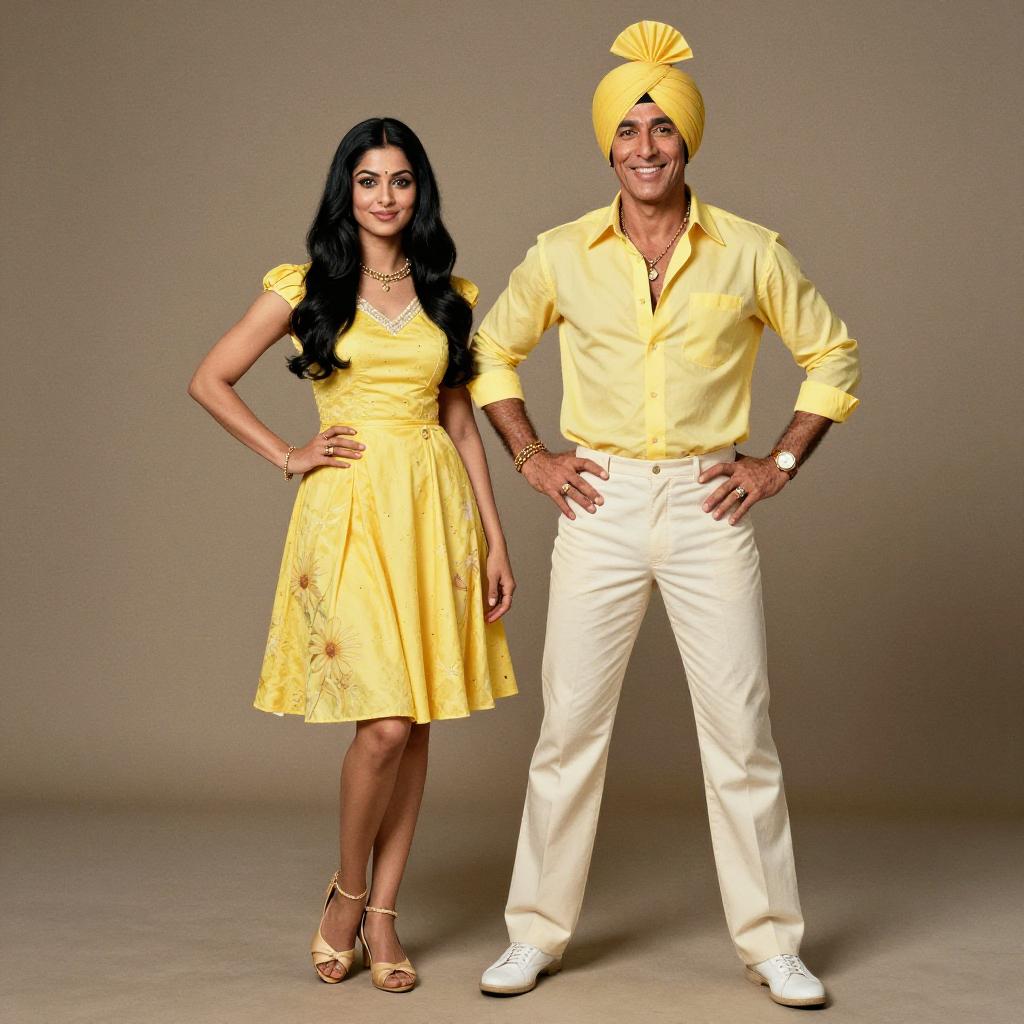 Studio portrait of an Indian man and woman standing side by side against a neutral brown background. The man wears a bright yellow shirt, cream pants, a matching yellow turban, and white shoes, accessorized with gold jewelry and a watch. The woman wears a yellow vintage-style dress with puffed sleeves and floral patterns, paired with gold heels and delicate jewelry. Both subjects have confident poses with hands on hips and are smiling, showcasing mid-20th century retro fashion with Indian cultural elements under soft lighting.