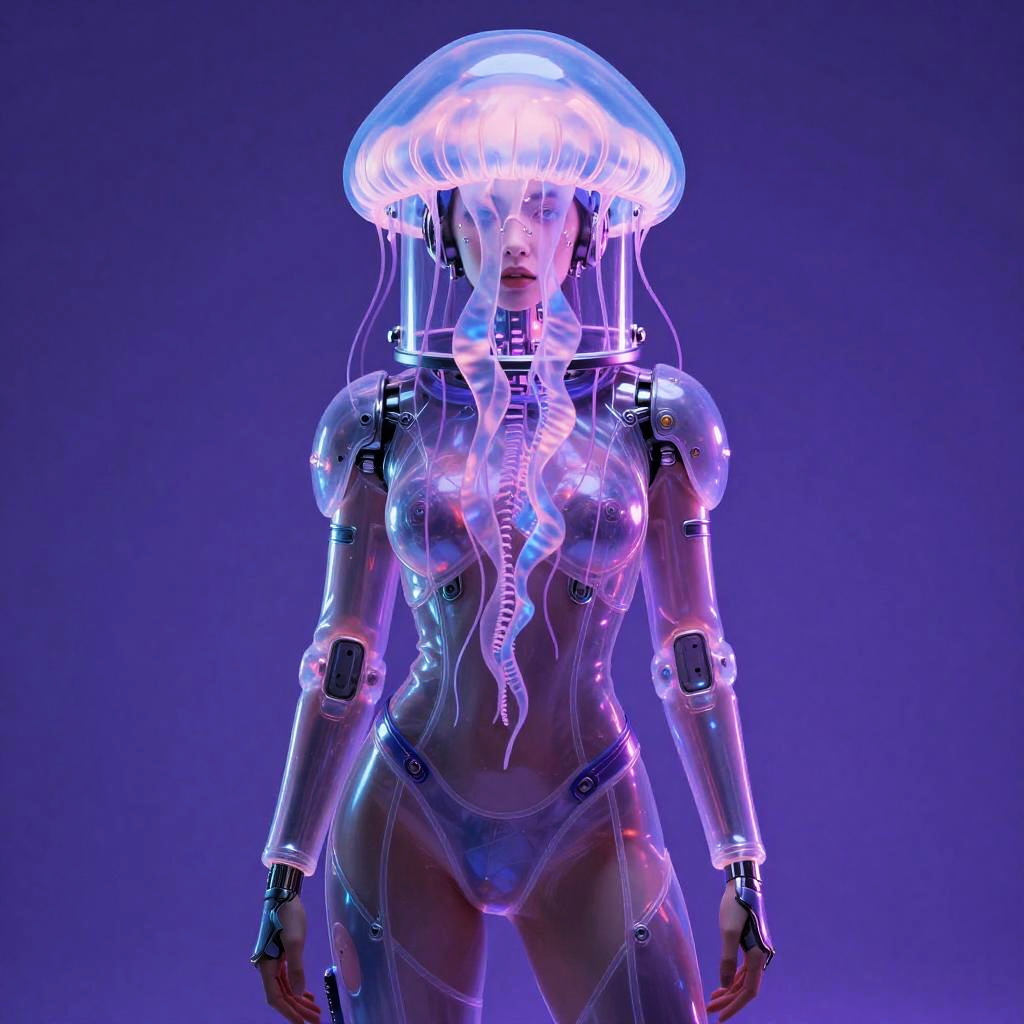 A woman dressed in a futuristic, translucent bodysuit seamlessly merges with an oversized jellyfish helmet, blending elements of marine life with sci-fi aesthetics. The image is rendered in a vibrant purple palette, showcasing a captivating mix of cybernetic and bioluminescent styles.