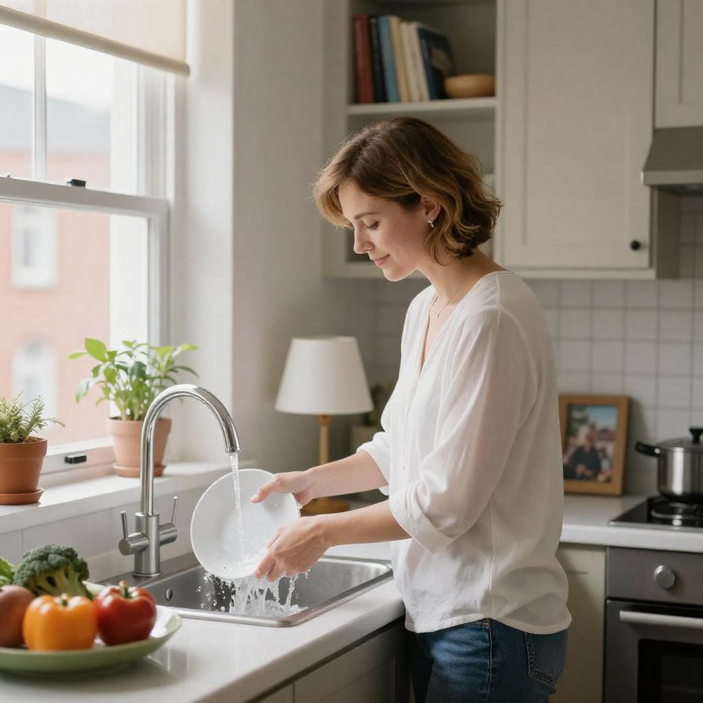 Woman with dark hair in striped apron cooks fish in a pot on cluttered kitchen counter. She uses a spatula, wearing a grey sweater, holding a white cloth. Various bottles, green onions, and bowls surround her. Background shows kitchen appliances and tiled wall. Second person's arm visible, helping. Intense focus on cooking task.