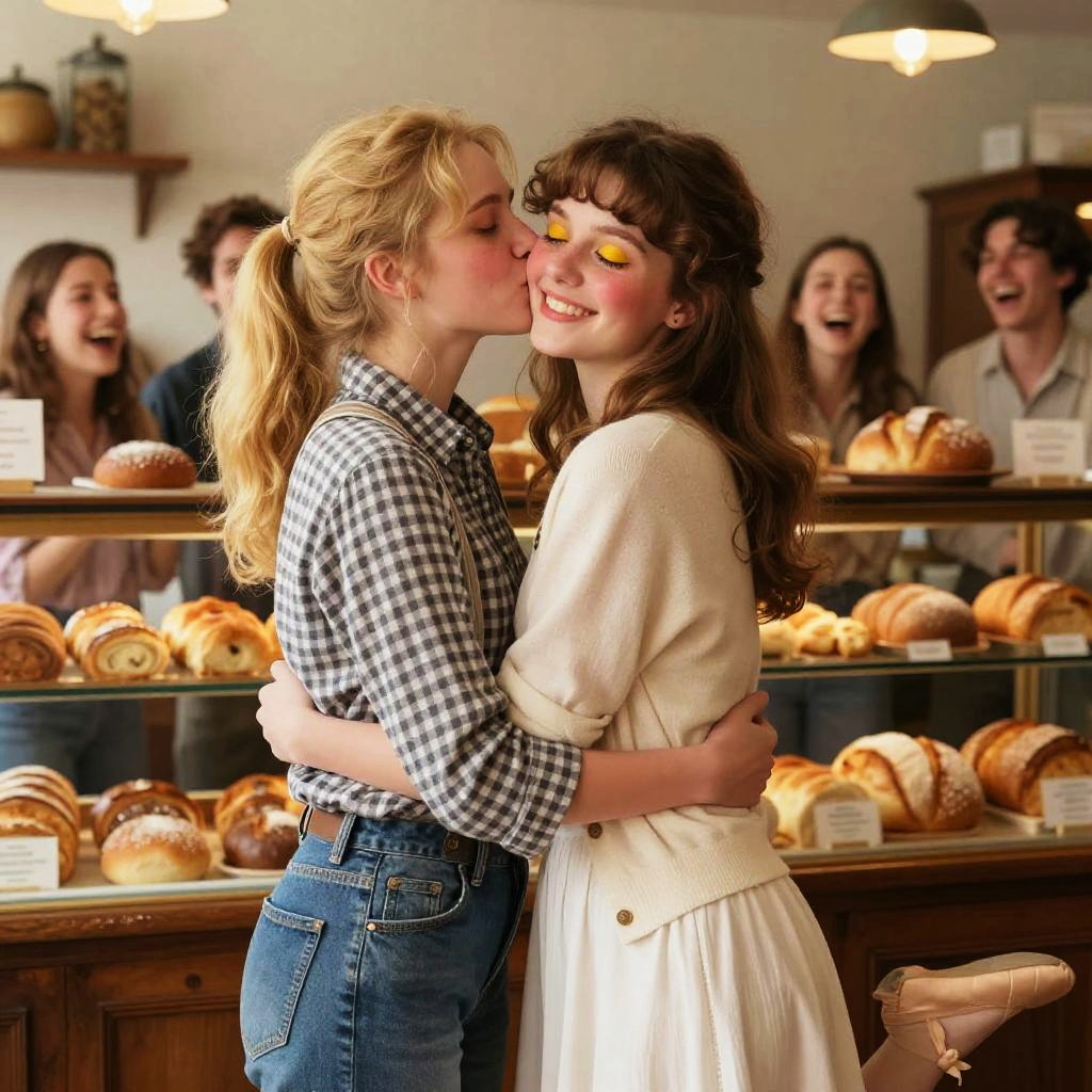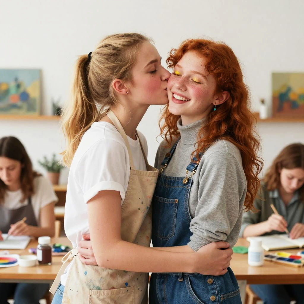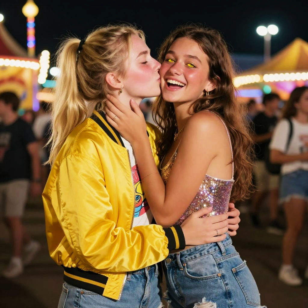 Two girls interacting in a colorful carnival night, embracing intimacy with a gentle kiss on the cheek and a warm hug, closed eyes and smiles showcase their emotions, characterized by blushes and an open mouth. A girl with a ponytail, blonde hair, bright bomber jacket with graphic tee, stands connected to a girl with brown hair, yellow eyes, sparkly top and denim shorts. They are surrounded by laughter and festive lights.