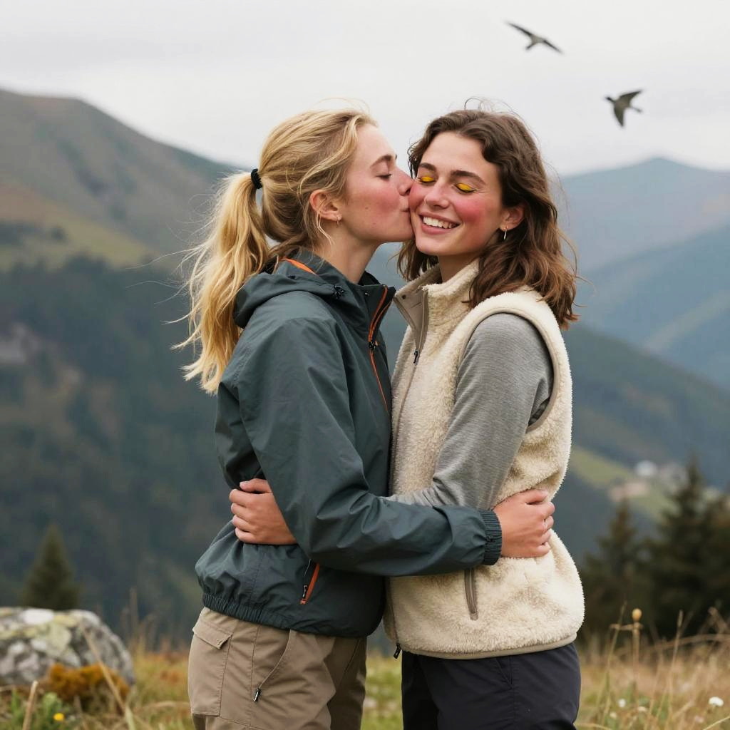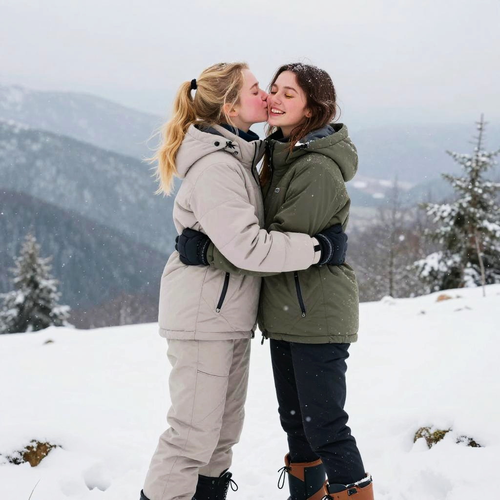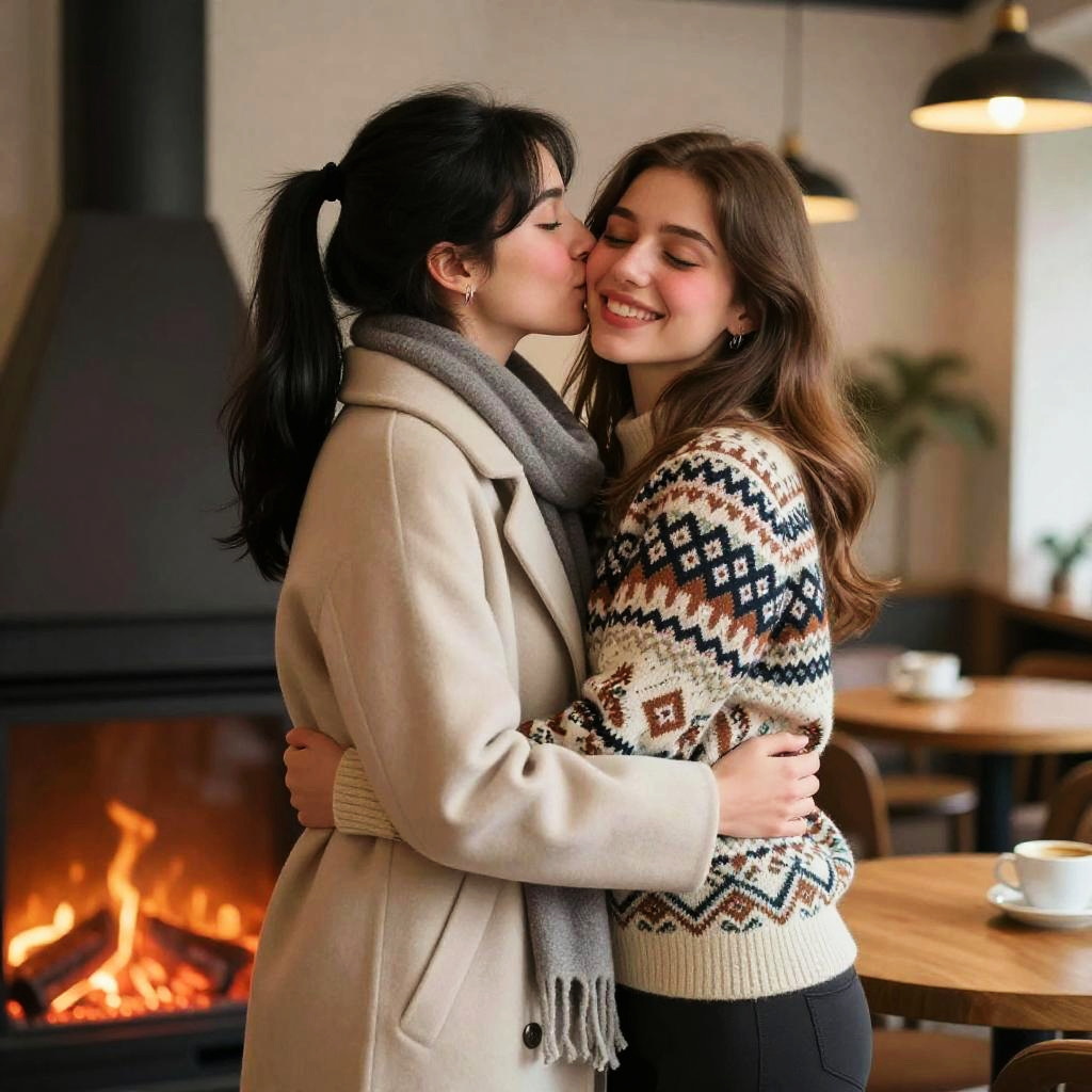 Two girls interacting in a colorful carnival night, embracing intimacy with a gentle kiss on the cheek and a warm hug, closed eyes and smiles showcase their emotions, characterized by blushes and an open mouth. A girl with a ponytail, blonde hair, bright bomber jacket with graphic tee, stands connected to a girl with brown hair, yellow eyes, sparkly top and denim shorts. They are surrounded by laughter and festive lights.
