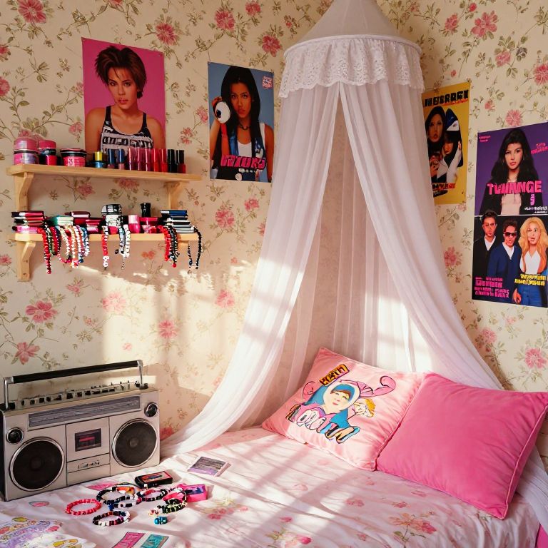 A nostalgic 90s girls bedroom decorated with floral wallpaper, a canopy over the bed, shelves filled with friendship bracelets and nail polish, a retro boombox playing cassette tapes, posters featuring 90s pop culture references, bright colors and sunlight casting soft shadows