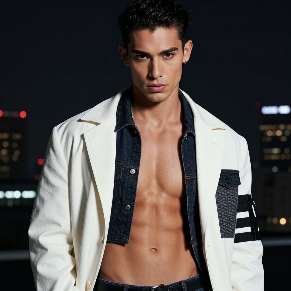 Photograph of a handsome, muscular male model with dark hair, wearing an open white jacket over a black shirtless shirt, against a nighttime cityscape