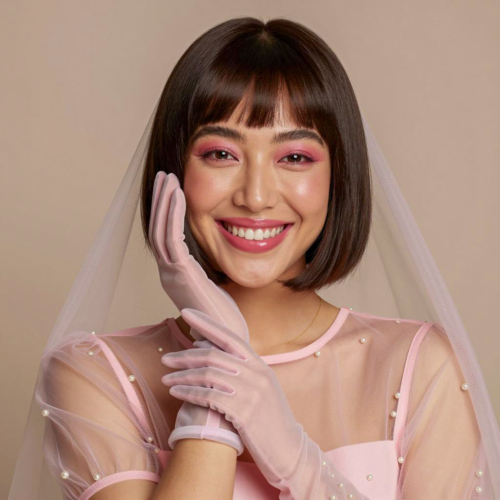 Photograph of a smiling woman with dark straight hair in a bob cut, wearing a translucent pink veil and matching gloves. She has pink eyeshadow, glossy pink lips, and light skin. She rests her left cheek on her left hand. She wears a sheer pink blouse with pearl accents. Beige background.