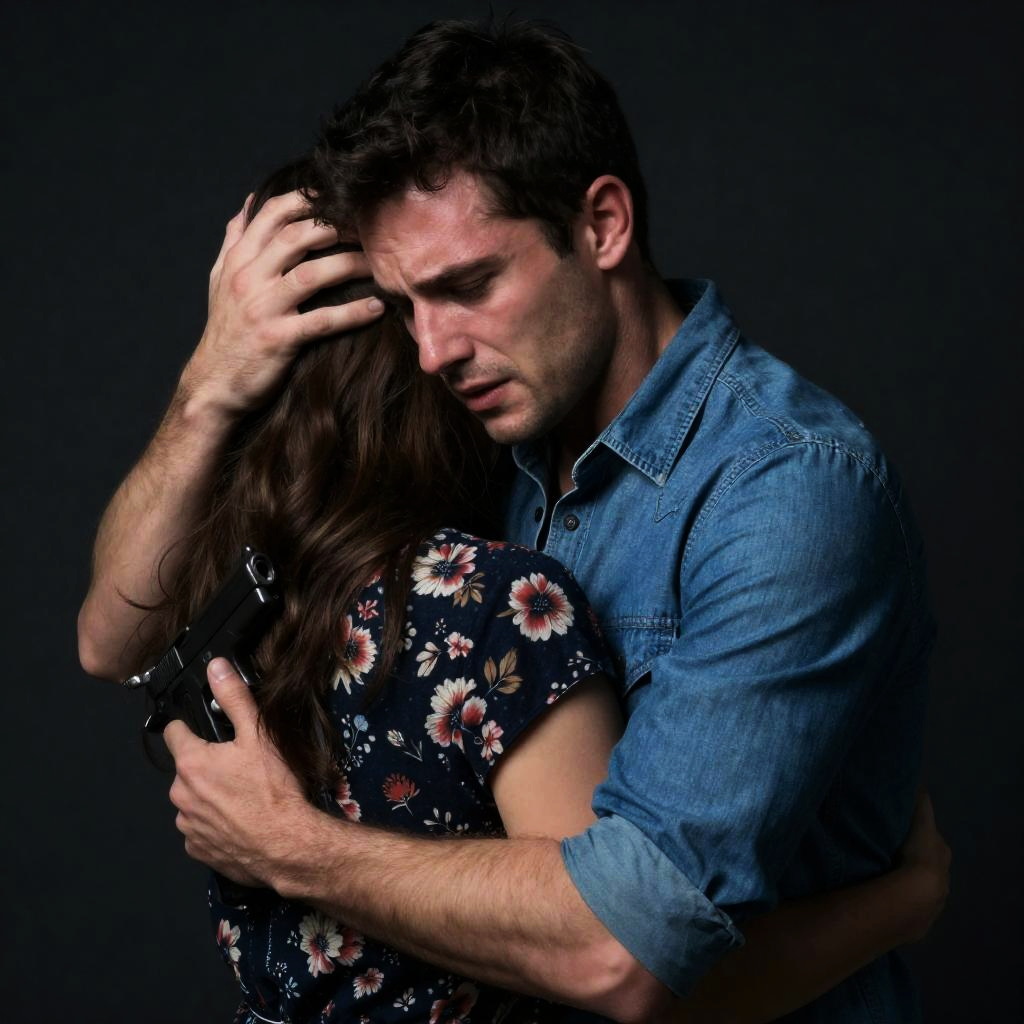 Photograph of a distressed man with short dark hair, wearing a blue denim shirt, hugging a woman with long brown hair, floral dress. His hand is on her head, his face shows intense pain. Dark background. Woman's face not visible. Man's left arm and hand hold a gun.