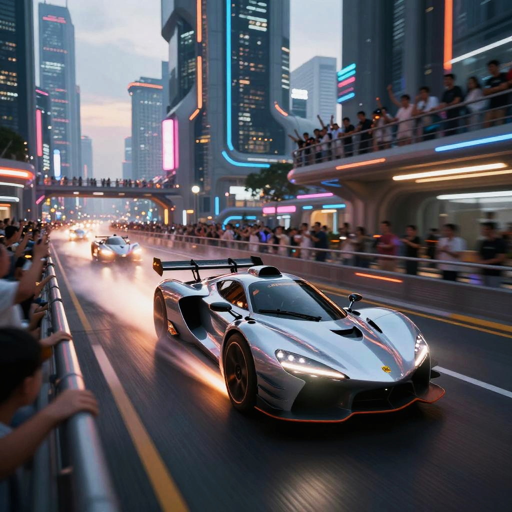 3088 high-speed hoverbike race through a sprawling futuristic metropolis, sleek vehicles leaving trails of light, crowds cheering on elevated platforms, intense motion blur, neon glow effects, high-energy scene with rich color palette