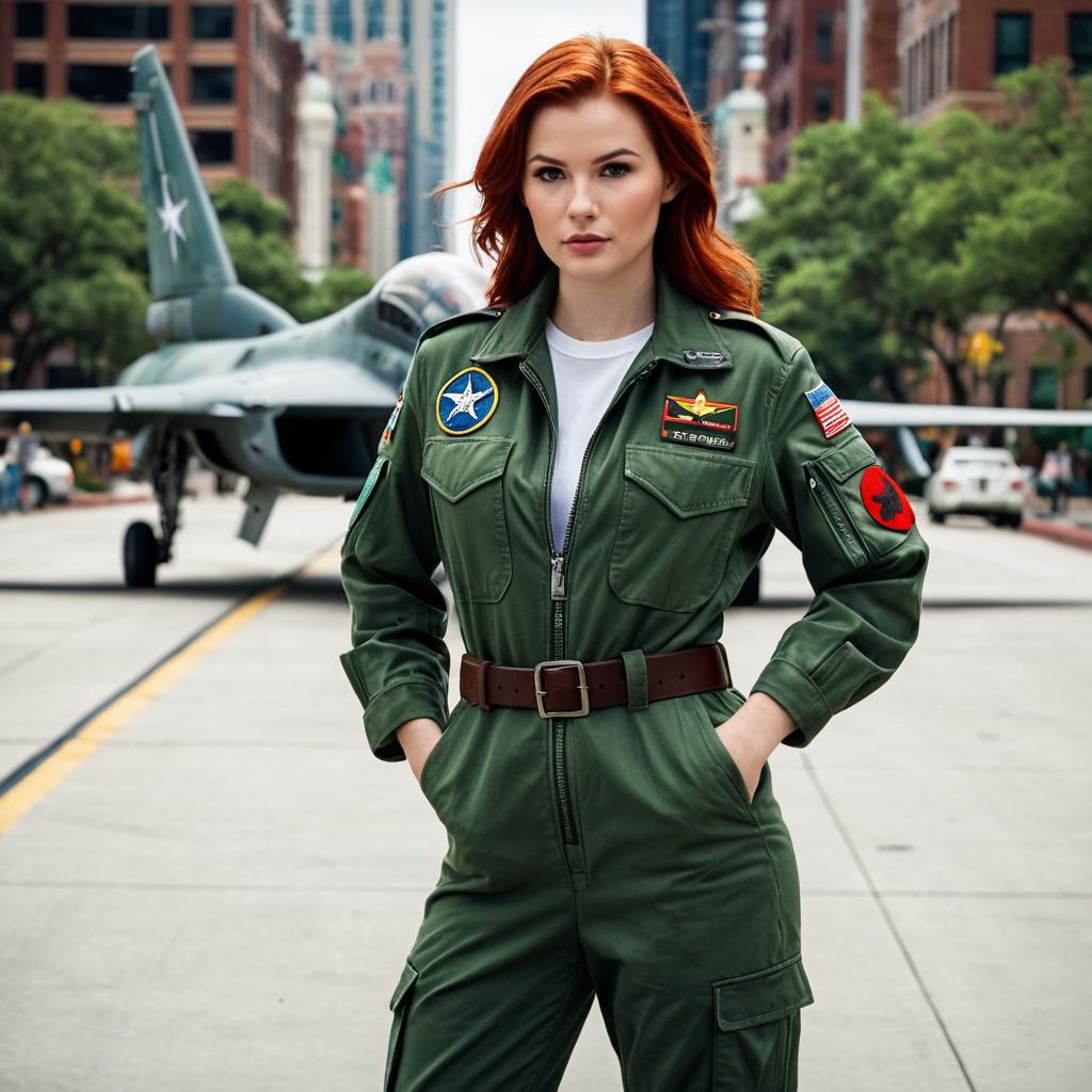 Disney wing pilot costume, photo of a young woman with red hair, wearing a green military-style jumpsuit with patches, standing on a city street, background shows blurred buildings and a green military aircraft, realistic, daytime, full body shot, serious expression, hands by sides, brown belt, white shirt under jumpsuit, detailed ures, natural lighting, realistic style, medium close-up