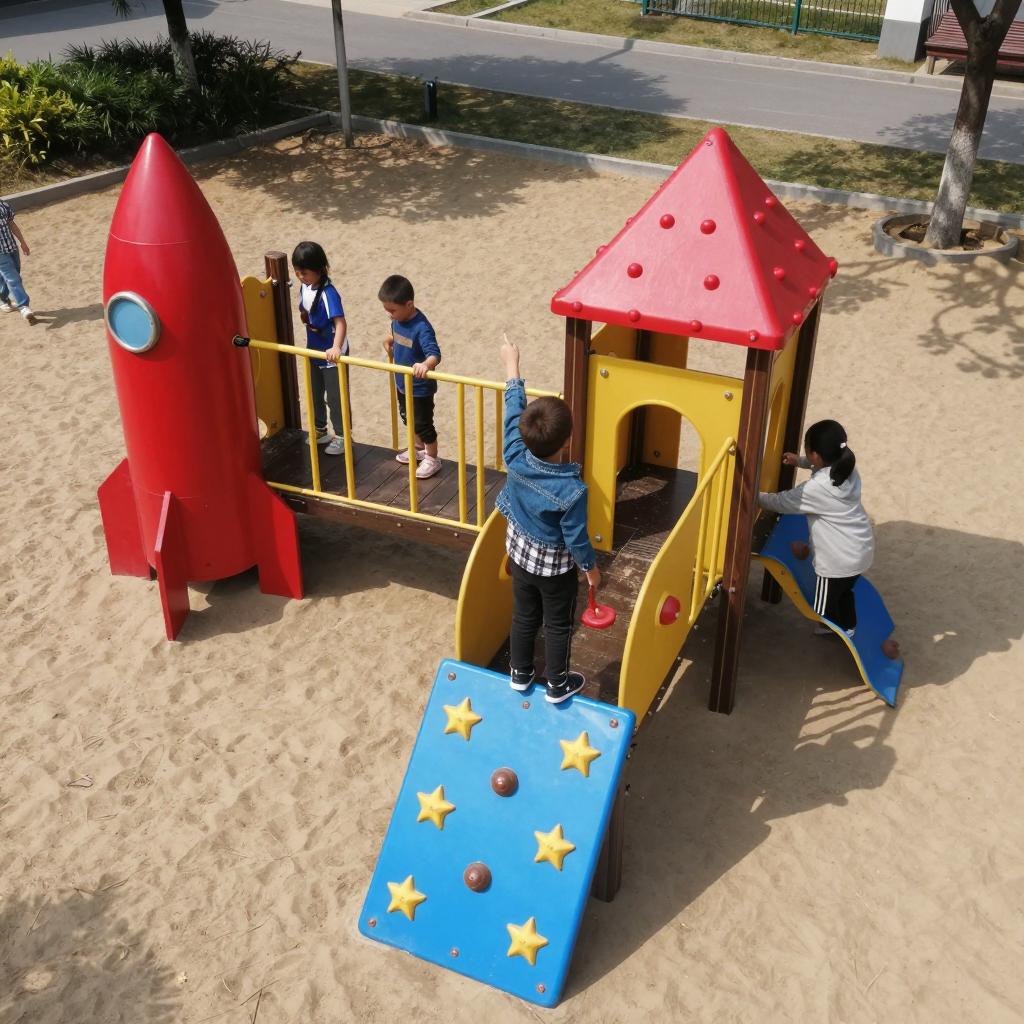 Aerial photograph of a playground. A boy with brown hair, wearing a blue denim jacket and plaid shirt, stands on a blue climbing structure with yellow stars, pointing upwards. Several other children play on different structures, including a red rocket ship and a yellow castle with red turrets. Shadows of trees and children are visible on the sandy ground.