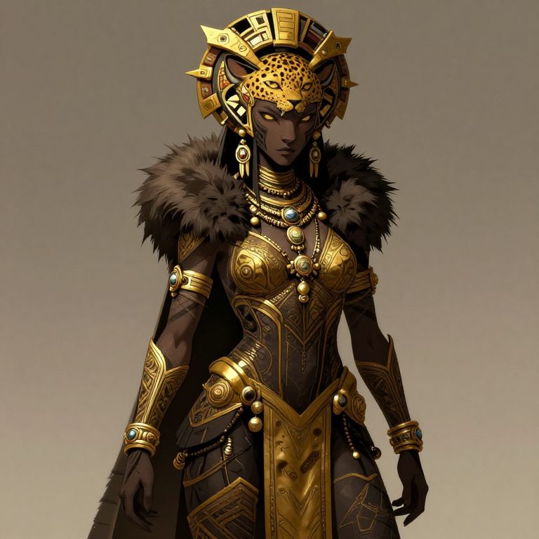 The image depicts a highly detailed, 2D anime character design that combines elements of tribal, alien, scifi, and fantasy themes. The character, a Panther witch, is adorned in intricate, ornate attire that features a mix of dark and golden hues, with elaborate patterns and textures. The character's headpiece is a striking combination of geometric shapes and animal motifs, including a large, circular element that resembles a leopard's face. The character's clothing includes a fur-lined garment and a series of layered necklaces and bracelets, each adorned with small, detailed ornaments. The overall composition is centered, with the character standing in a poised, confident stance. The background is a muted, neutral tone, allowing the character's detailed attire and accessories to stand out prominently. The art style is reminiscent of Mike Mignola and Alphonse Mucha, with a focus on rich, textured details and a strong sense of character.
