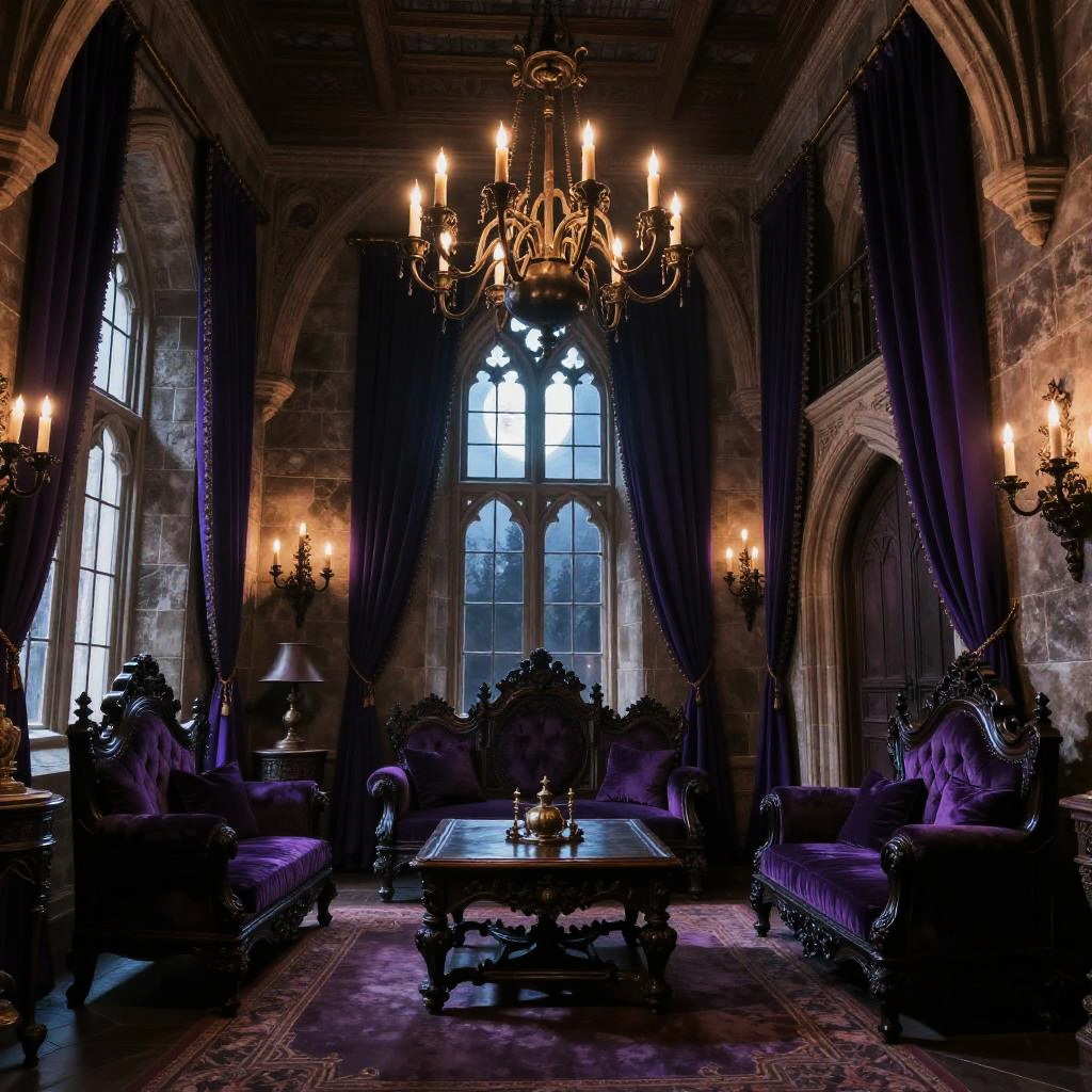 Vampire living room set in a medieval castle with stone walls, massive iron chandeliers dripping with candles, deep purple drapes framing tall windows, a gothic arch doorway, carved mahogany furniture, and an elegant but ominous ambiance filled with shadows and faint moonlight.