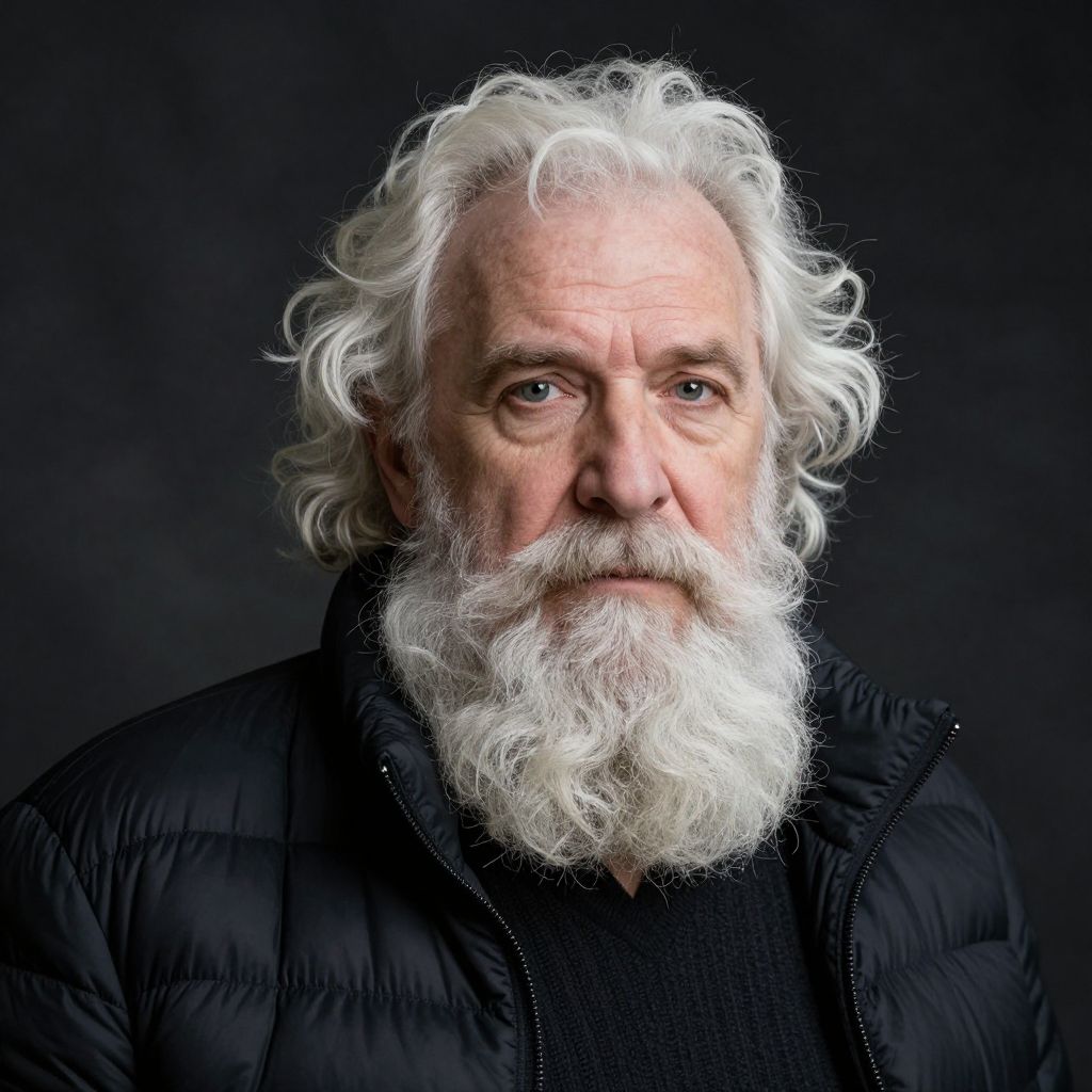 Photograph of an elderly white man with a full, wavy white beard and grey hair, wearing a black, puffy jacket over a dark sweater. His expression is serious, with slightly furrowed brows and blue eyes looking directly at the camera. The background is a dark, gradient black, highlighting his white hair and beard. The lighting is soft, accentuating the texture of his beard and jacket. His complexion is fair, with visible wrinkles on his forehead and cheeks. The overall mood is solemn and introspective.