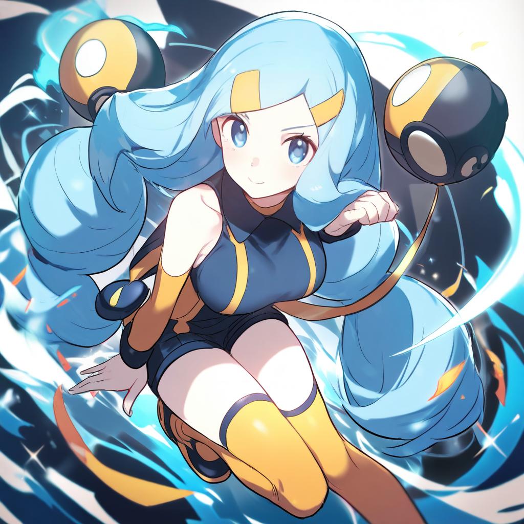 Ace trainer (pokemon), pokemon, 1girl, long hair, blonde hair, blue hair, by artist hiraga matsuri, animagine