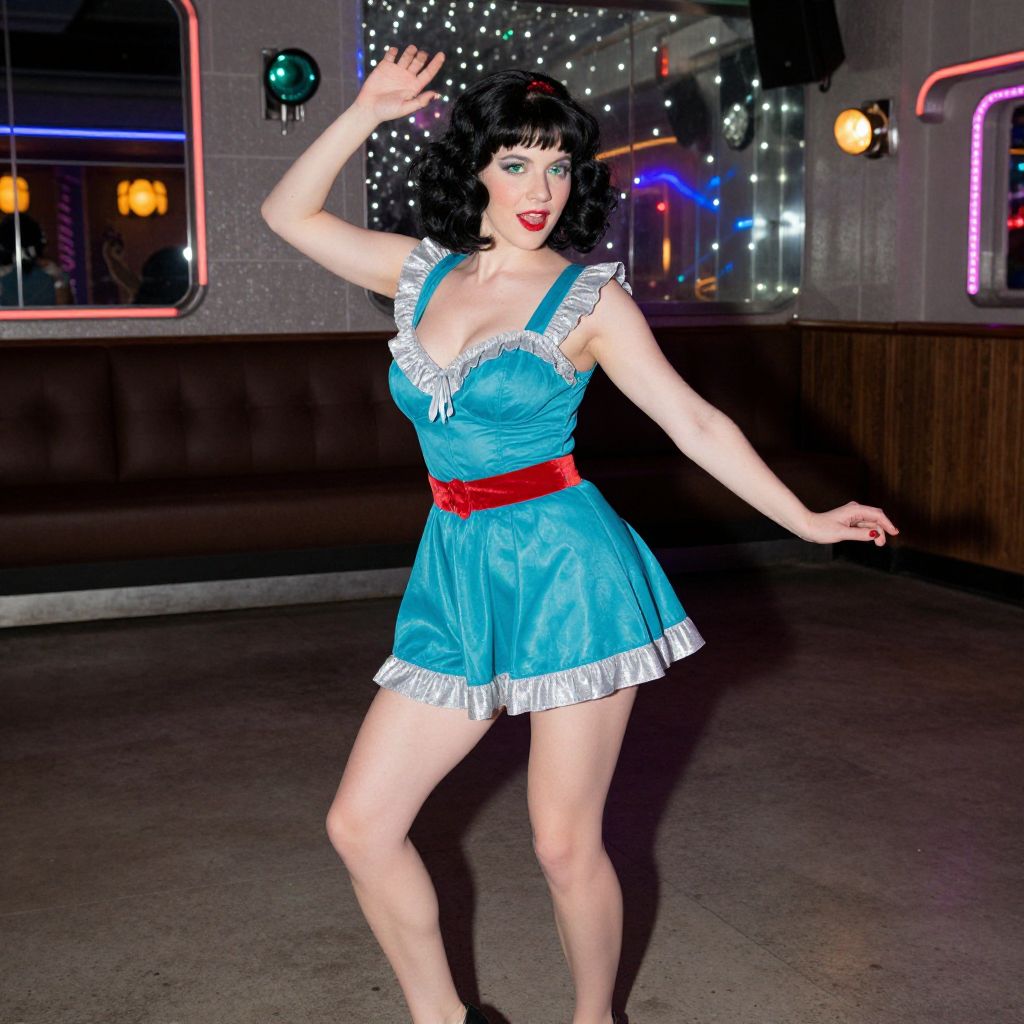 Photograph of a fair-skinned woman with black, wavy hair and bright red lipstick, striking a dance pose in a dimly lit, retro-style bar. She wears a blue, sleeveless, satin dress with white frilled trim and a red belt, accentuating her medium-sized breasts. Neon lights in pink, blue, and green illuminate the background, casting a colorful glow on the brown leather bench and gray tiled walls. Her right arm is raised, and her left arm is extended to the side. The floor is dark, adding contrast to her brightly colored outfit and the vibrant background.