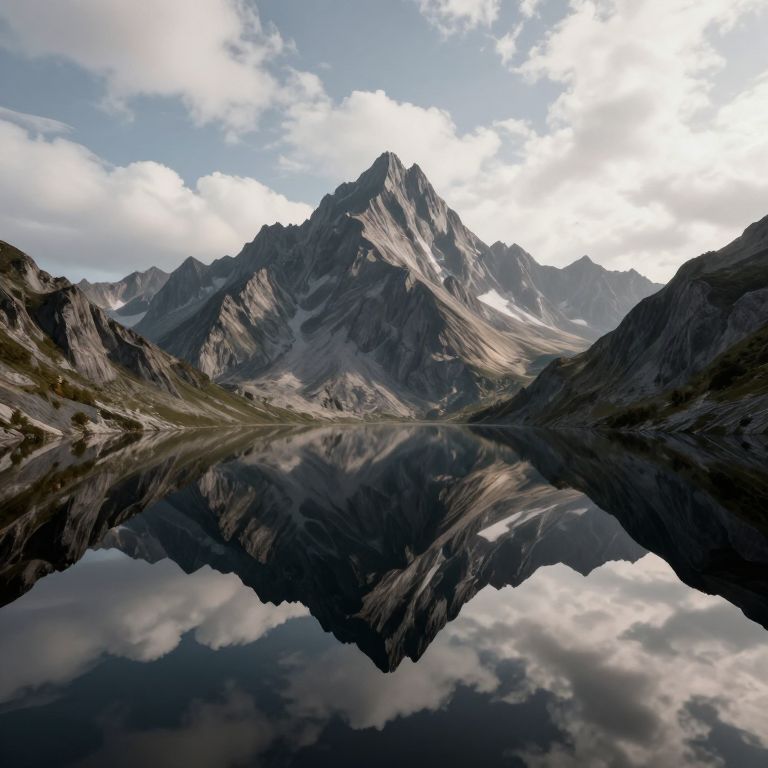 A serene 3D-rendered landscape showcases majestic mountains mirrored perfectly in a tranquil, black lake, creating an illusion of inverted peaks beneath a sky filled with drifting clouds, evoking a dreamlike, hyper-realistic visual effect.