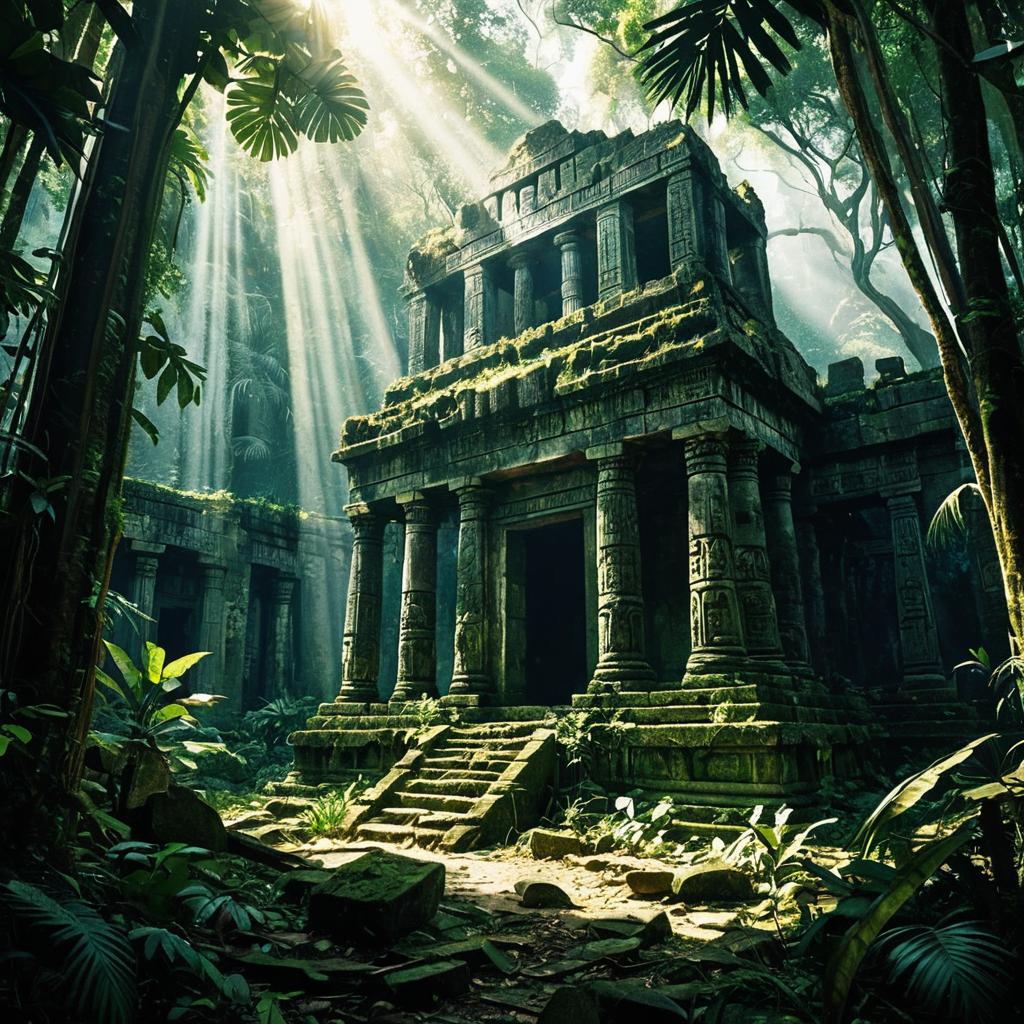 Ancient Jungle Temple Ruins with Sunlight Rays