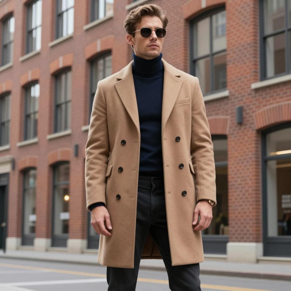 An artistic image featuring a stylish man dressed in a classic overcoat and turtleneck, striking a confident pose in front of a modern brick building.