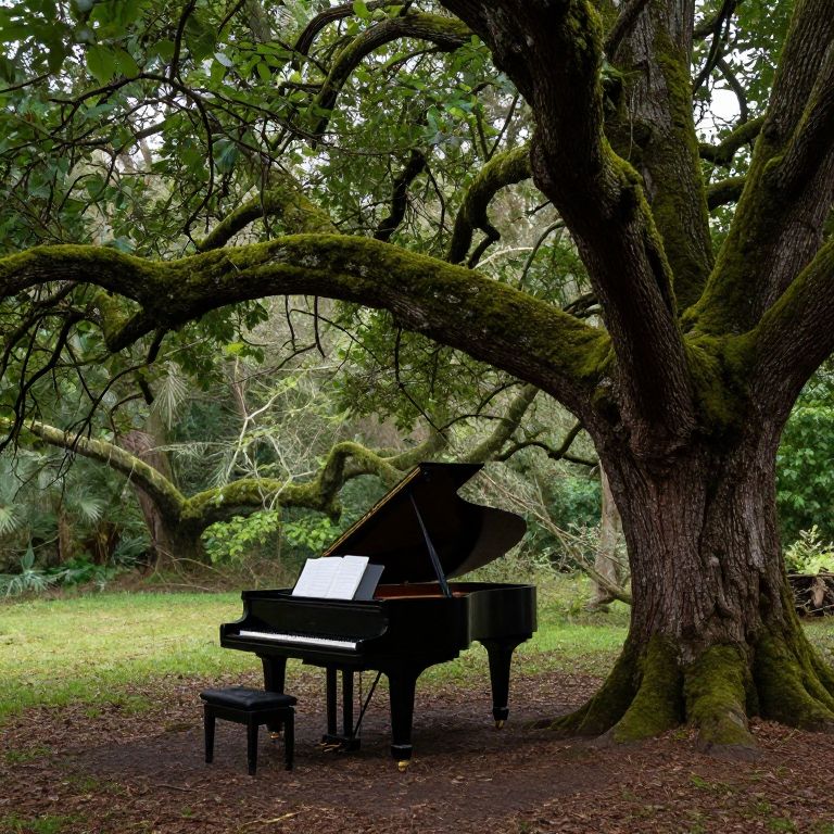 Serenity whispers through the ancient branches of a moss-covered tree, cradling a grand piano whose music seems to breathe life into the forest, weaving melodies that resonate with the timeless harmony of nature and the soul.