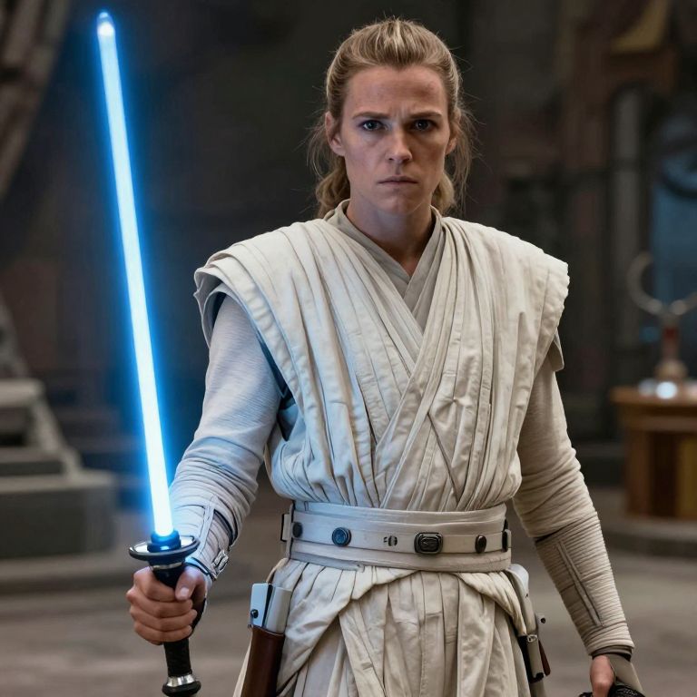 Photograph of a young white man with long, light brown hair tied back, wearing a white Jedi robe with a belted waist and black wristbands. He holds a glowing blue lightsaber in his right hand, positioned at his side. His expression is serious and focused. The background is a dimly lit, industrial-style setting with blurred metallic and wooden elements. The image has a cinematic, sci-fi feel, reminiscent of the Star Wars franchise. The lighting highlights the blue glow of the lightsaber and the texture of his robe.