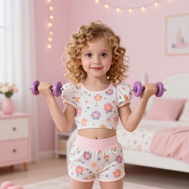 Photograph of a young girl with curly blonde hair, wearing a white crop top and matching shorts adorned with colorful flower patterns, holding purple dumbbells at shoulder height. She has fair skin and a cheerful expression. The background features a pink bedroom with string lights, a white bed with pink bedding, and a pink nightstand with a small potted plant. Soft, natural light fills the room, creating a warm, inviting atmosphere. The girl stands slightly off-center, with the bed and nightstand to her right.
