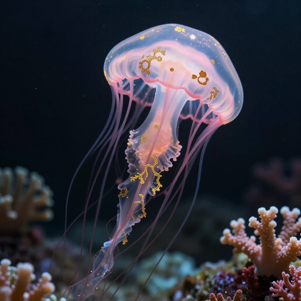 Photo RAW, (Black and pink : Portrait of a ghostly jellyfish, shiny aura, highly detailed, gold filigree, intricate motifs, organic tracery, by Android jones, Januz Miralles, Hikari Shimoda, glowing stardust by W. Zelmer, perfect composition, smooth, sharp focus, sparkling particles, lively coral reef background Realistic, realism, hd, 35mm photograph, 8k), masterpiece, award winning photography, natural light, high detail