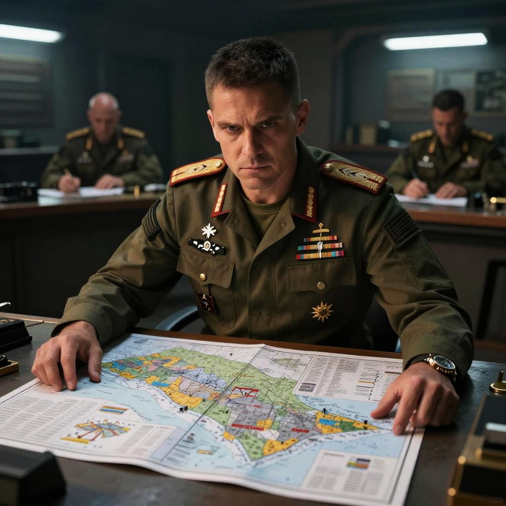 Authoritative military commander in a war room, wearing decorated uniform, maps and strategic plans spread out on the table, strong posture, focused eyes, dim lighting with spotlight on leader, gritty and intense atmosphere, photorealistic rendering.