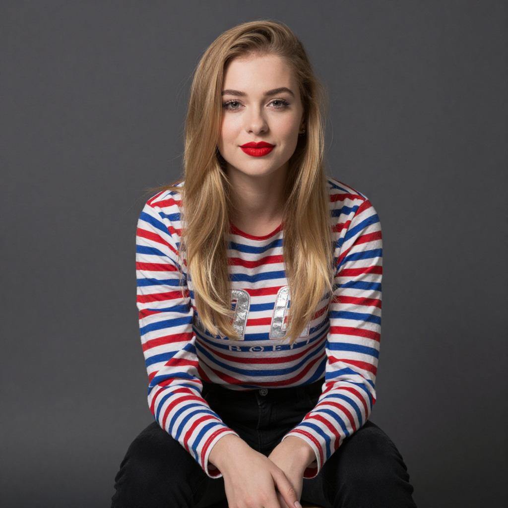 Photograph of a young woman with long blonde hair, fair skin, and red lipstick, wearing a red, white, and blue striped long-sleeve shirt with a silver graphic, and black pants. She sits against a dark gray background, hands clasped in front, looking directly at the camera with a slight smile.