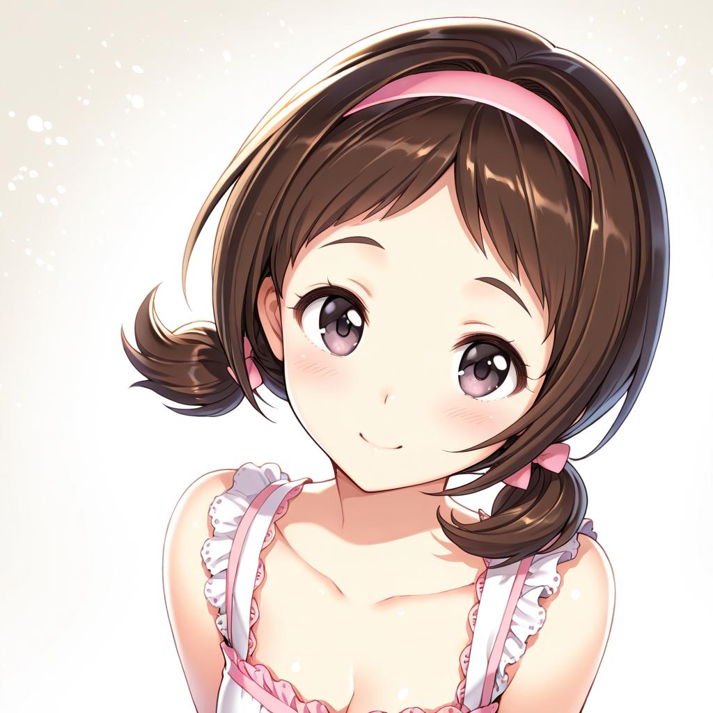 This is a digital anime-style illustration of a young girl with large, expressive purple eyes and fair skin. She has short, brown hair with side pigtails, adorned with a pink headband. Her cheeks are slightly blushed, and she has a gentle smile. She wears a white, frilled, sleeveless top with pink straps. The background is plain white, making her the focal point. The artwork is characterized by bright colors, soft shading, and a clean, polished look typical of contemporary anime illustrations.