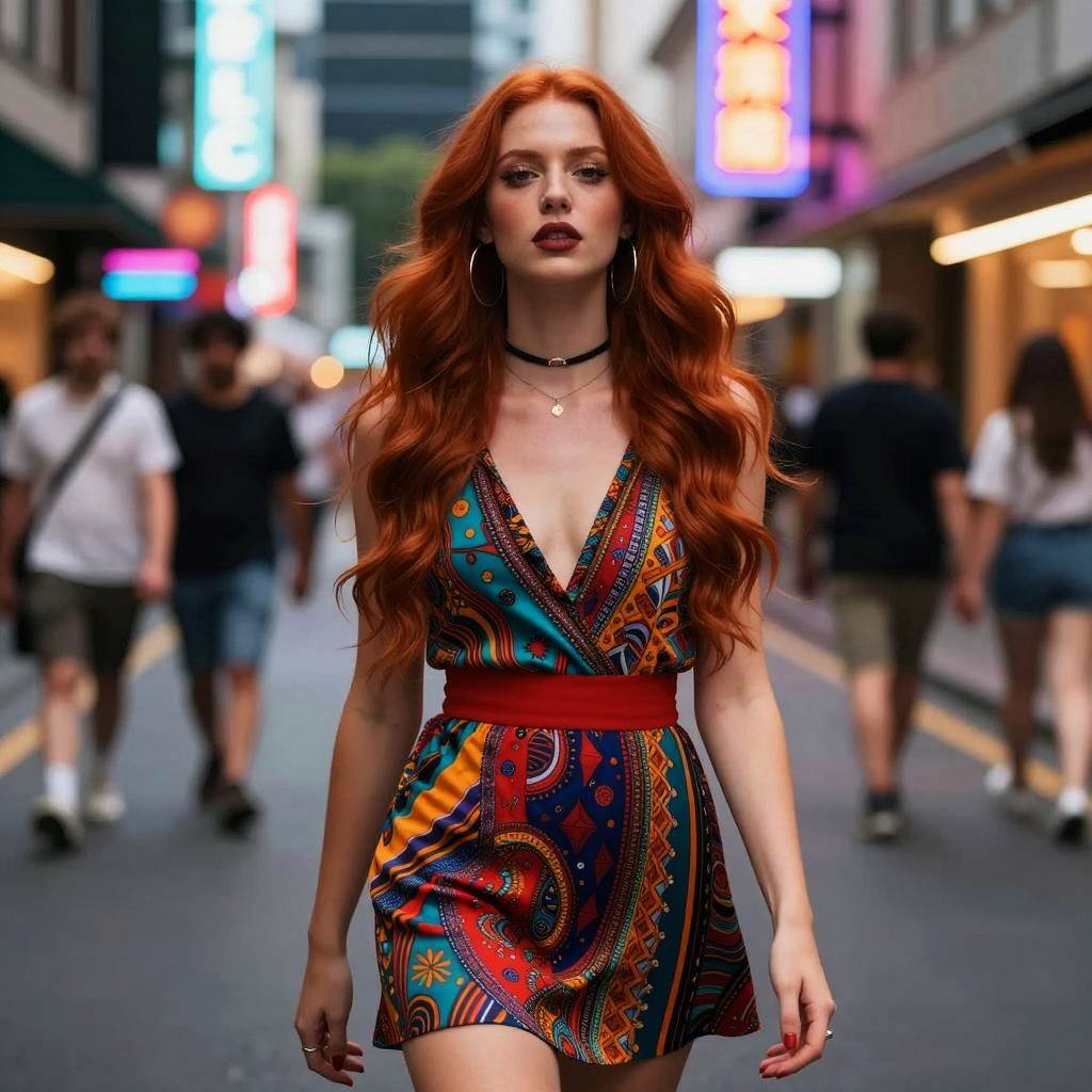 This vibrant image showcases a striking woman with long red hair, dressed in a colorful patterned dress, standing confidently in a neon-lit street. The scene captures an energetic urban atmosphere, highlighting the dynamic interplay of lights and colors characteristic of a lively night out.