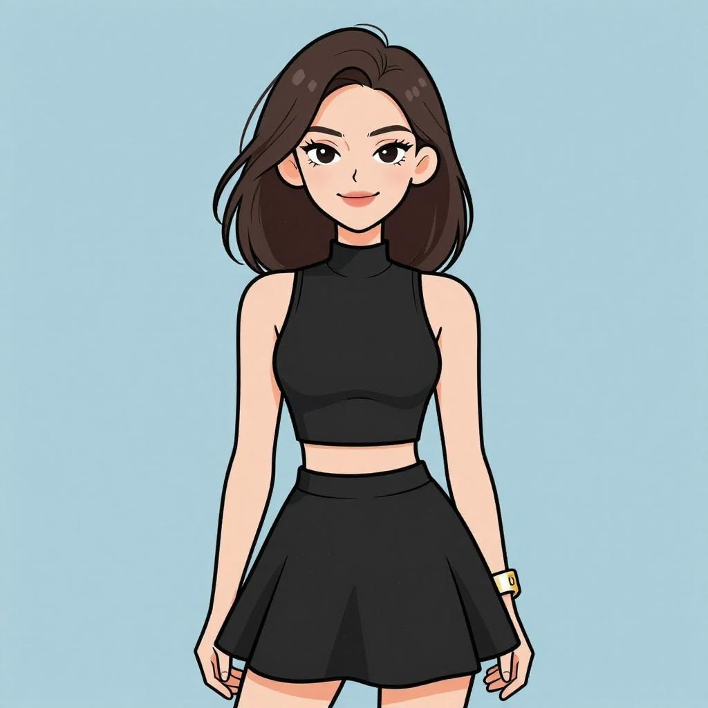 This is a digital drawing of a young woman with fair skin and straight, dark brown hair that reaches her shoulders. She has large, expressive brown eyes and a small, confident smile. She is wearing a black, sleeveless crop top that reveals her midriff and a matching black, high-waisted, flared skirt. On her left wrist, she wears a white wristwatch. The background is a solid light blue, making her dark outfit stand out. The art style is reminiscent of modern, clean-line anime or manga, with bold colors and simple shading.