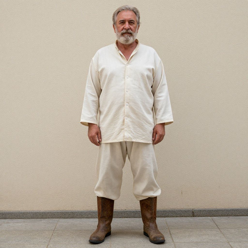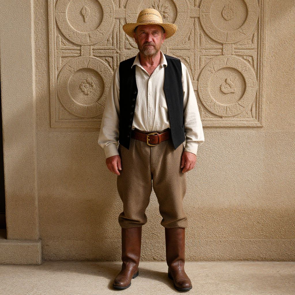 A photograph of an older white man with a weathered face, wearing a straw hat, beige shirt, black vest, and brown pants tied with a leather belt. He has brown leather boots and a brown beard. He stands in front of an intricately carved stone wall with circular patterns, casting a shadow on the ground. The lighting highlights his rustic, historical outfit and the textured wall behind him.