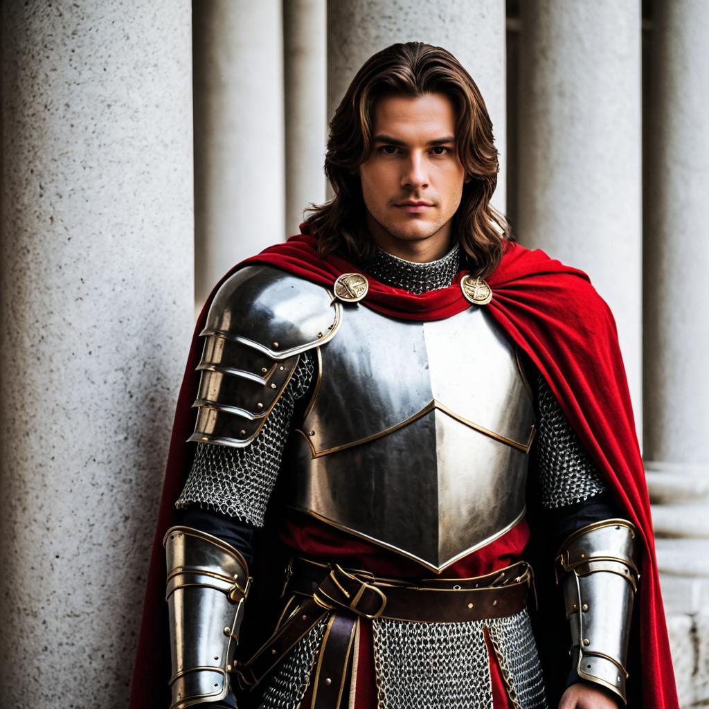 Sir lancelot costume,solo, armor, 1boy, male focus, cape, looking at viewer, pillar, brown hair, shoulder armor, breastplate, column, red cape, standing, realistic, pauldrons, chainmail, closed mouth, long hair