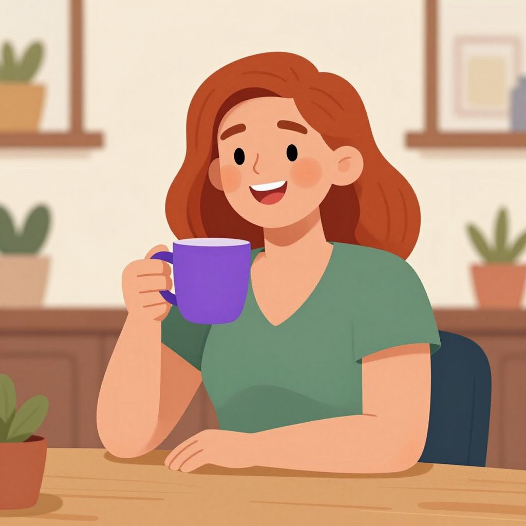 A vibrant cartoon-style illustration depicts a cheerful woman with red hair sitting at a wooden table, holding a purple cup, exuding warmth and positivity in a cozy indoor setting, capturing the essence of empowerment and celebration on International Women's Day.