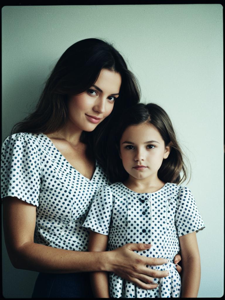 Woman with Daughter in Matching Outfit, waist-up editorial portrait, photorealistic tones