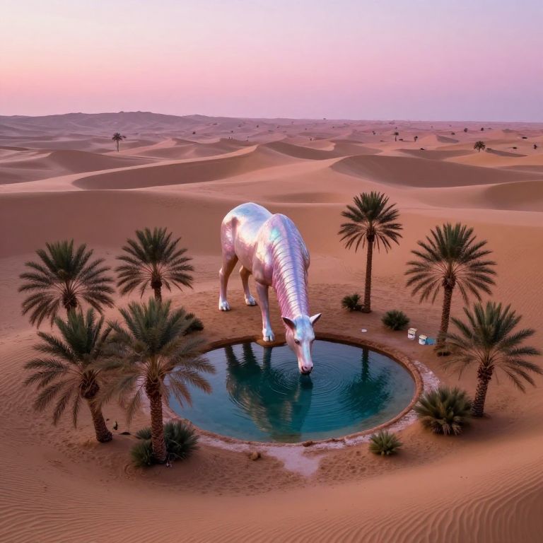 An aerial perspective reveals a tranquil desert sanctuary at dusk, illuminated by the soft pink tones of twilight which delicately bathe the surrounding dunes in an enchanting light. Nestled within this mystical haven stands a majestic creature with a shimmering coat, its ethereal form drinking from the pristine waters of the oasis surrounded by palm trees. This mesmerizing tableau artfully intertwines the whimsical allure of dreamlike realms with the captivating realism of nature's splendor, evoking a sense of awe and serenity reminiscent of the surrealistic masterpieces that redefine our perception of reality.