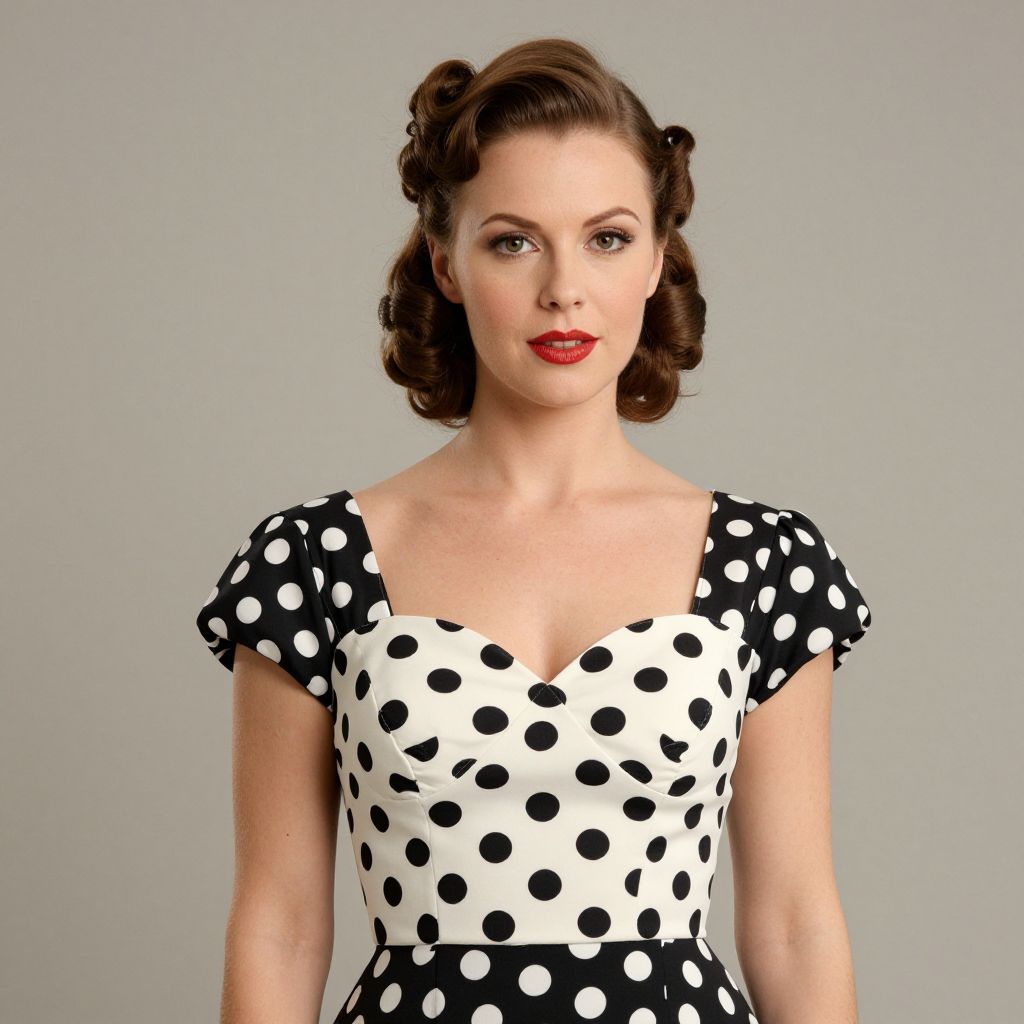 Woman wearing a vintage 1930s-1940s polka-dot dress with a sweetheart neckline and puff sleeves, complemented by a classic pin curl hairstyle.