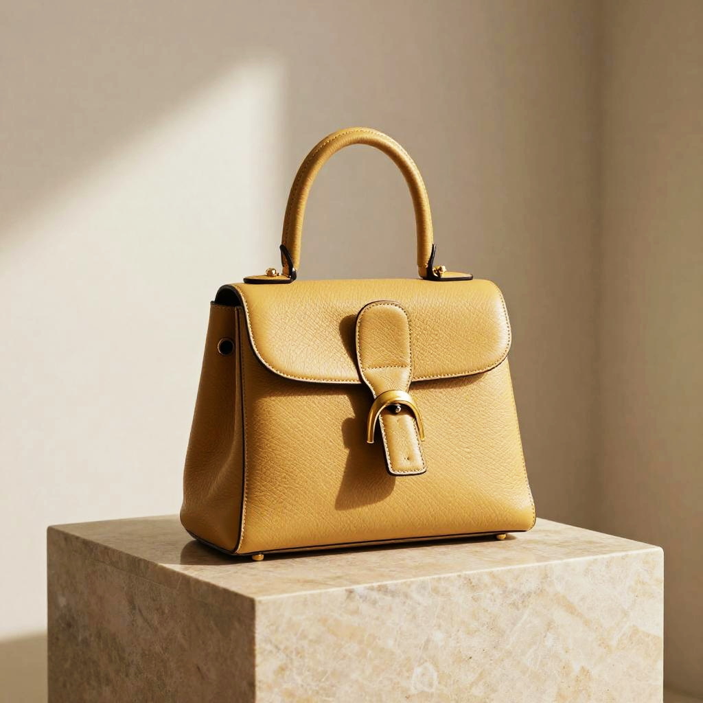 Delvaux inspired elegant luxury handbag on a marble pedestal, soft natural lighting, warm golden tones, intricate leather texture, minimalistic background, high fashion studio shot