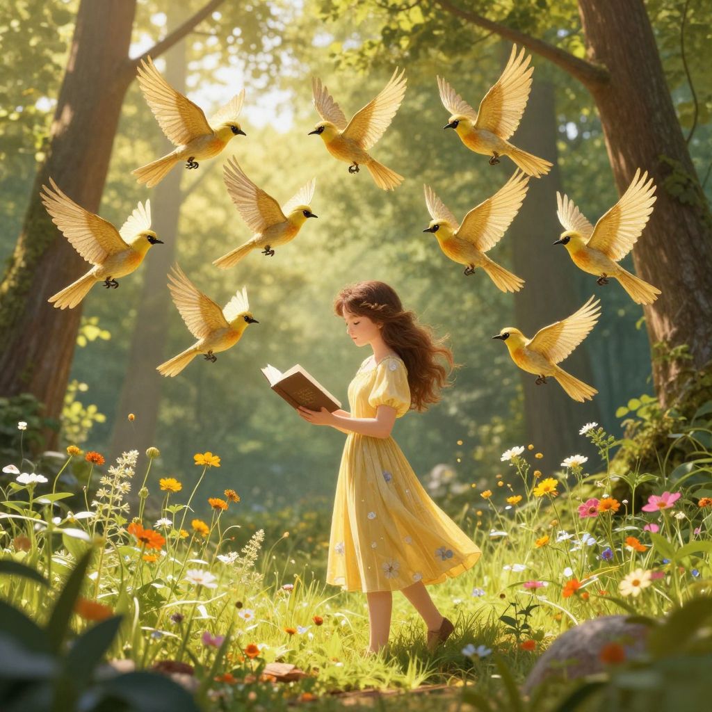 Woman reading a book amidst a vibrant forest scene, surrounded by seven golden-winged birds soaring gracefully above her, as sunlit wildflowers bloom around her feet.